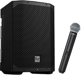 Aktiver Akku Lautsprecher mit Handfunkmicro, für musikalische Darbietungen, Sprachverstärkung und Audiowiedergabe. Eingebauter 4-Kanal-Digitalmixer mit FX (fußschaltergesteuert), Feedback-Unterdrückung und Ducking-Funktionen. 400W, 8-Zoll-Tieftöner mit SST-Waveguide, 1-Zoll-Titankalotten-Hochtöner, wetterfesten Gehäuse, 100°x100°, Bluetooth, 12V Power Out, Lithium-Ionen-Akku mit langer Laufzeit, bis 6 Stunden bei maximalem Ausgangspegel, mit Transporttasche